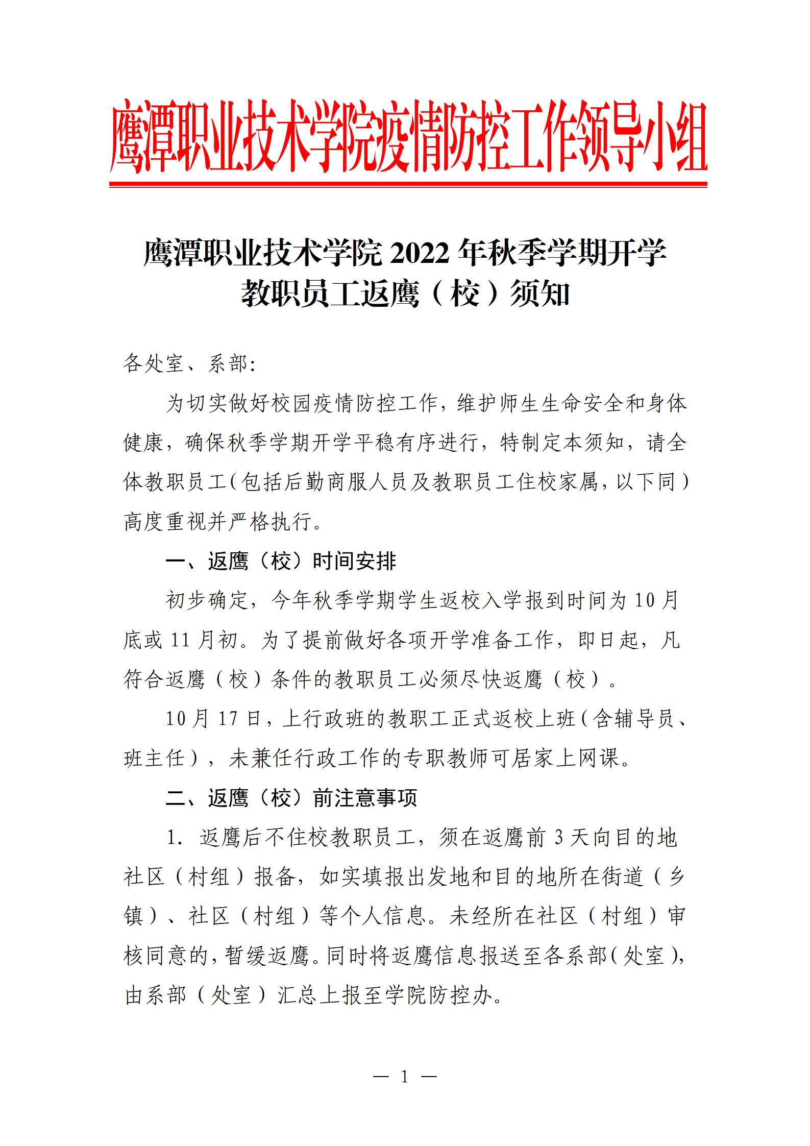 beat365唯一官方网站2022年秋季学期开学教职员工返鹰(校)须知